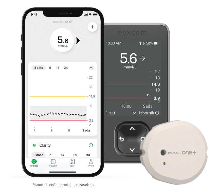 *Ako upozorenja i očitanja razine glukoze uređajem Dexcom ONE+ ne odgovaraju Vašim simptomima ili očekivanjima, za donošenje odluka o liječenju povezane s dijabetesom upotrijebite glukometar.